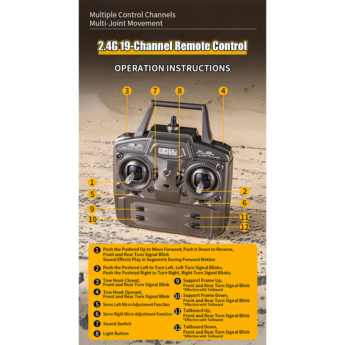 .Full-Function Controls: Supports forward, reverse, left/right turns, hook up/down, servo fine-tuning (left/right), and sound on/off, delivering a highly flexible and precise driving experience for various play scenarios.
