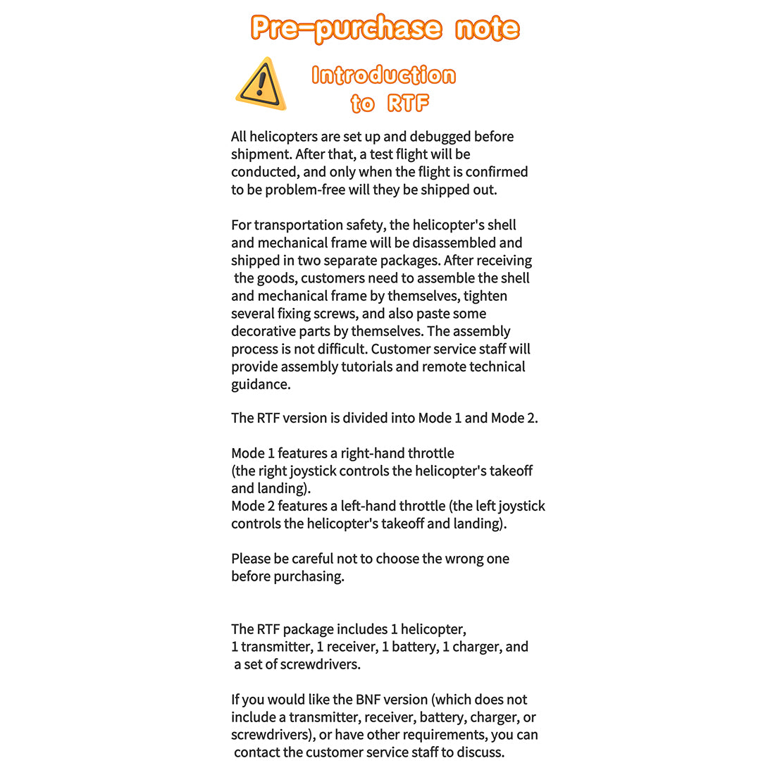 RC model helicopters are classified as high-risk products. Always keep a safe distance from people during flight. Improper assembly, unfamiliar operation, component damage, or malfunctioning electronic controls may lead to flight loss or unpredictable accidents. Pilots must exercise caution and fully accept personal responsibility for any incidents resulting from negligence.
