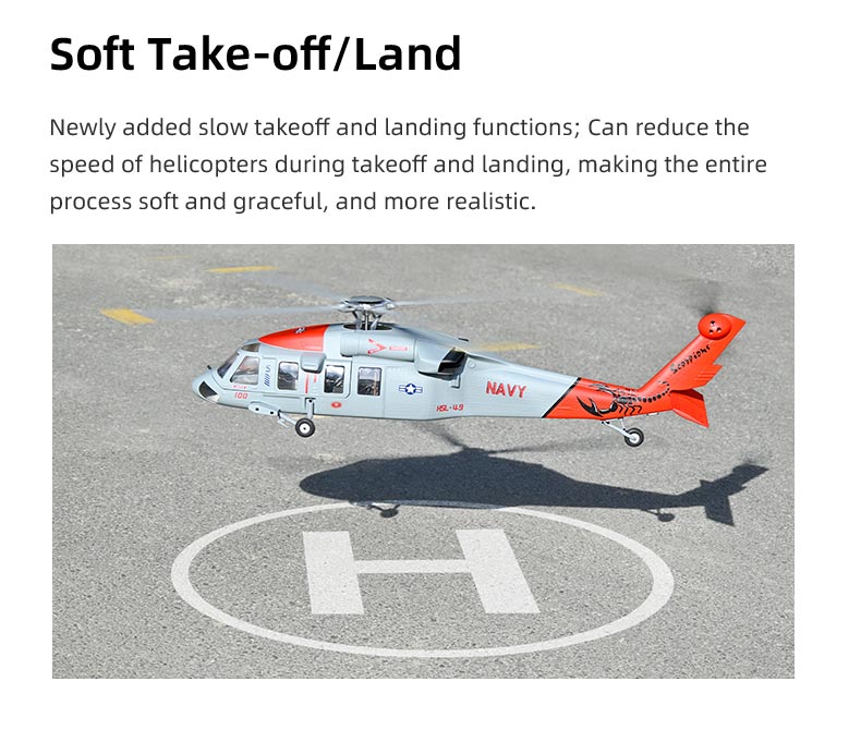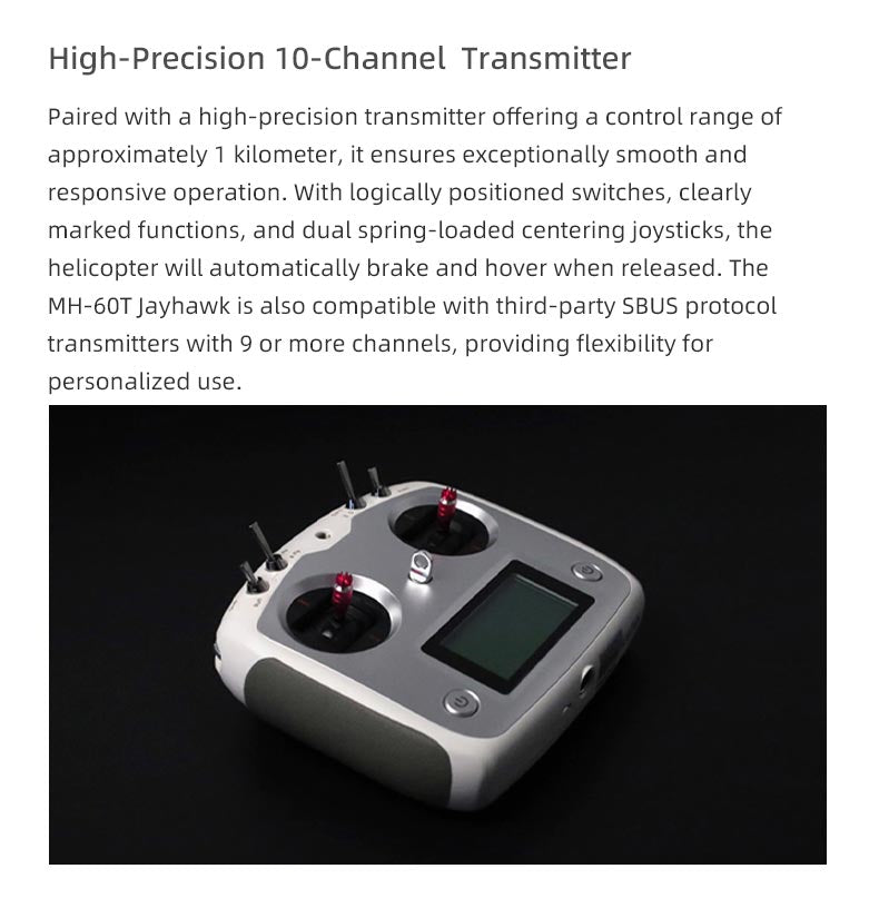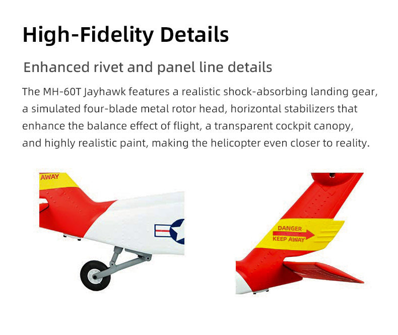 .True-to-Life MH-60 Military Design: Modeled after the iconic MH-60 helicopter, this 470-class scale RC model features a fully detailed fuselage, quick-release rotor blades, and a 6-channel setup that captures the authentic look and flight characteristics of the real aircraft.