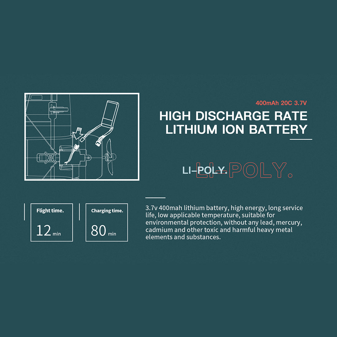 .Smart Safety + Longer Flight Time: USB protected charger prevents over-charge; 3.7V 400 mAh 20C Li-Poly battery provides up to ~12 minutes of glide endurance.